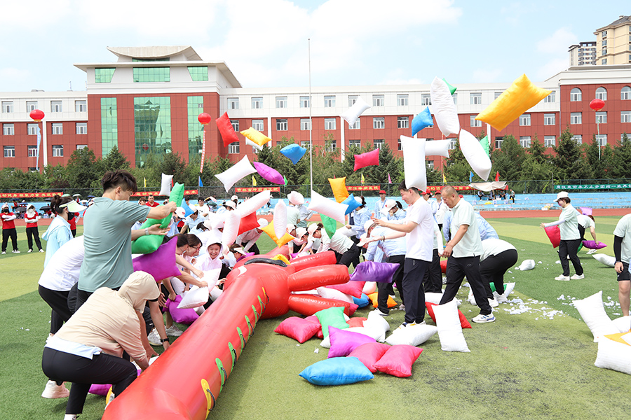 “枕头大战”“搭桥过河”等项目,既具有挑战性又不乏趣味性。“枕头大战”比赛,随着裁判员一声哨响,双方队员争先恐后地将对方扔过来的枕头再拼命扔回去;在“过河项目”中,为了争分夺秒完赛,不时有队员因为失去平衡而掉下“桥”去。此时成绩已经不重要了,大家都尽情地享受着比赛带来的趣味,欢笑声、呐喊声此起彼伏,仿佛每个人都回到了无忧无虑的童年中。