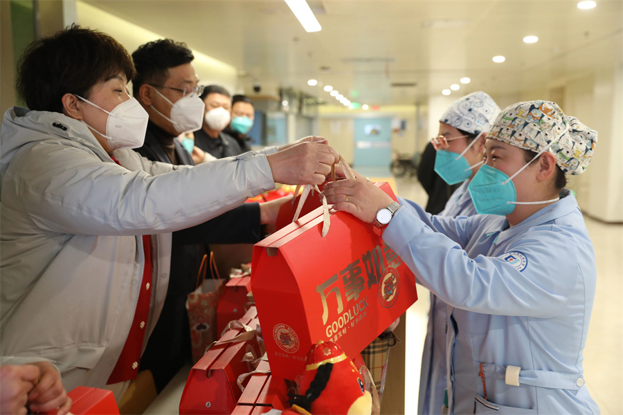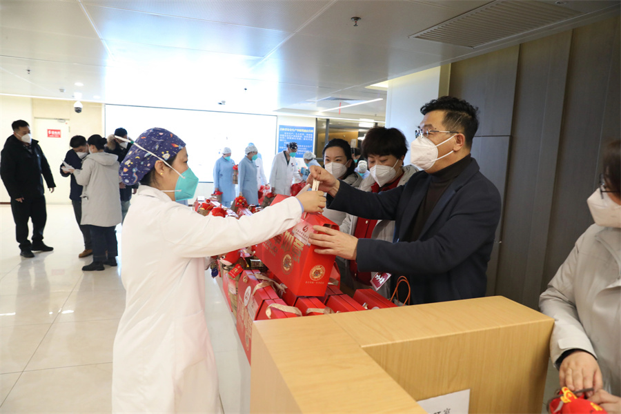 随后,院领导亲手为大家送上了精心准备的红包、热气腾腾的饺子以及满载祝福的大礼包,每一份礼物都蕴含着对值班人员深深的敬意和节日的美好祝愿。礼包中的蛇年玩偶寄托了对新的一年里活力满满、机智应对各种挑战的美好祈愿;苹果蕴含着对职工及其家属新年平安喜悦的美好祝愿;橙子寓意医务工作者能够心想事成,愿望成真;饮料传递出对大家百事顺遂、快乐无限的深切期盼;巧克力则是希望大家在新的一年生活甜如蜜。
