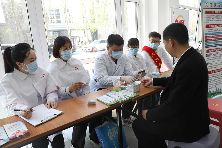 护士长于介然与护理部干事刘丹丹,护士张雨、王平萍为居民提供免费测血糖、血压、血氧服务,受到辖区居民的称赞。