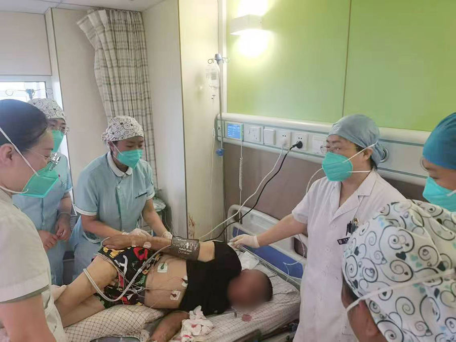 值班医生刘芳闻讯立即赶到病房,发现患者正在大口大口咯血,面部青紫、呼吸困难、意识不清,在立即给予止血药的同时,她紧急联系了抢救医疗总值陈艳萍副主任以及护理总值赵丽萍护士长。得到消息后,她们飞奔上楼,指导并参与紧张的抢救工作。