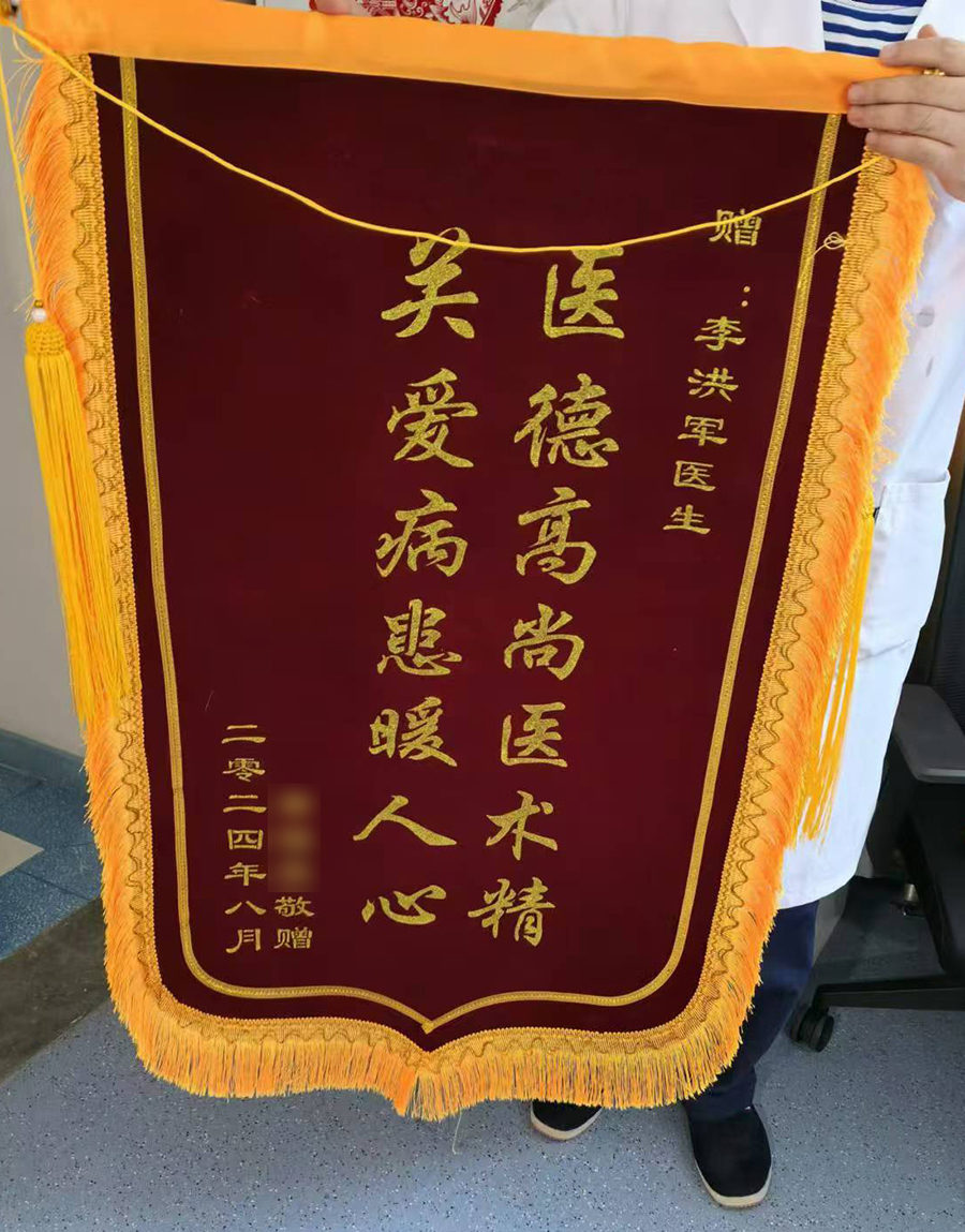 一周后,患者颅压降至正常范围,尿管也顺利拔除。9月30日,患者病情好转并顺利出院。中心医护人员的精心诊疗获得了患者及家属的一致好评。为表达感激之情,家属向李洪军医生和张新伟护士长赠送了两面锦旗。