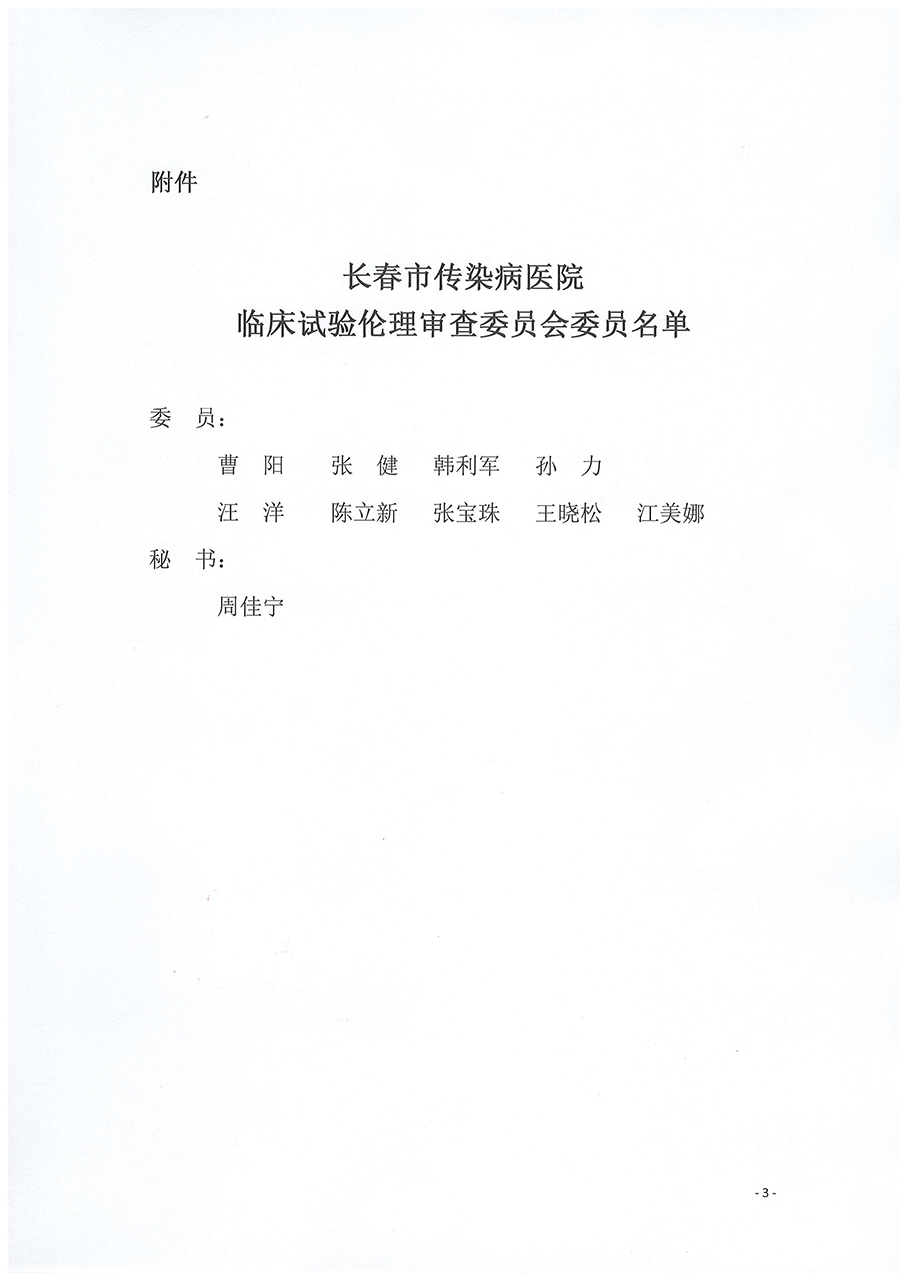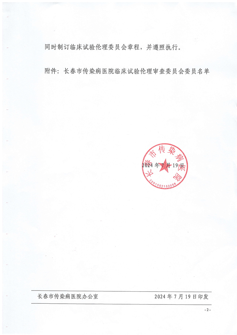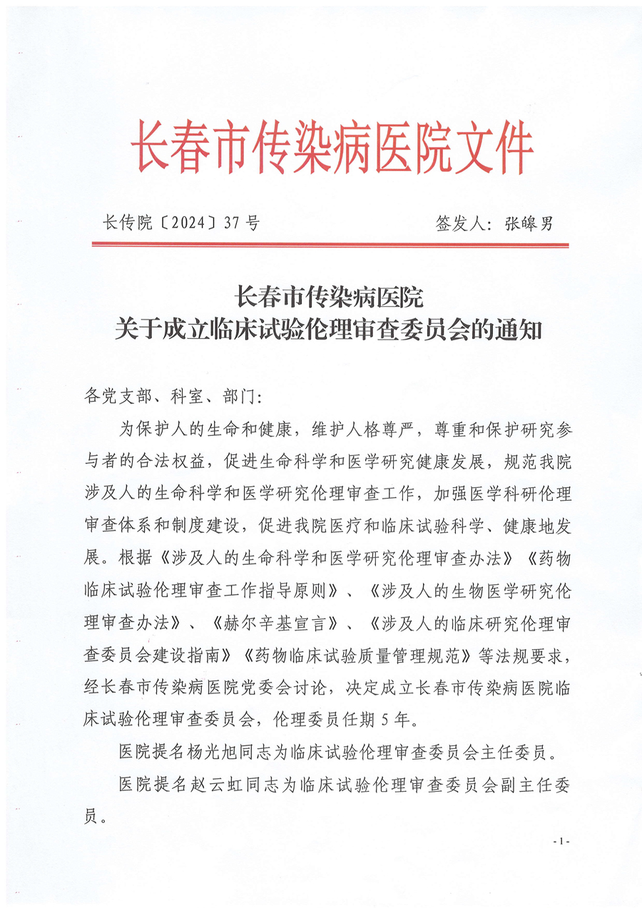 长春市传染病医院关于成立临床试验伦理审查委员会的通知 长春市传染病医院 |2024-10-29 13:24 上一篇线上就能挂号、缴费、查报告,微信服务号升级啦! 下一篇长春市传染病医院全面启用医疗收费电子票据 返回列表 相关信息 【喜报】长春市传染病医院两个专科获批长春市第一批名医工作室 2024-06-21 2025年度长春市传染病医院部门预算 2025-02-24 长春市传染病医院医药代表“三定三有”接待管理规定 (试行) 2023-11-23 喜报 | 长春市传染病医院结核内科荣获2023年市级临床重点专科 2023-09-19 长春市副市长赵显到市传染病医院调研指导工作 2023-09-20