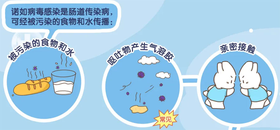 食用或饮用被诺如病毒污染的食物或水,也会导致传染。