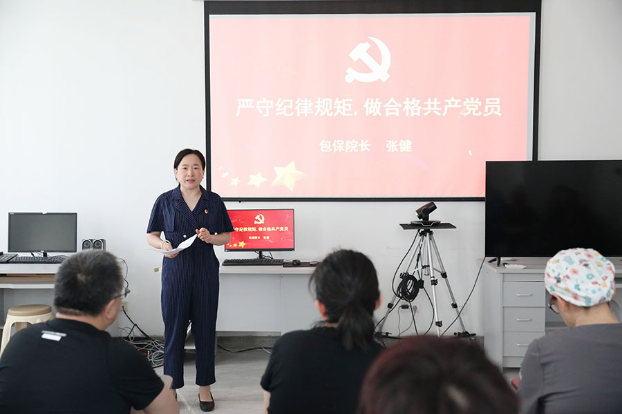 在“七一”到来之际,为进一步引导党员干部树立纪律意识、规矩意识和底线意识,做到懂法纪、知敬畏、存戒惧,6月21日,包保领导副院长张健为一疗区(综合科)党支部、二疗区(外科)党支部等党支部的党员讲授专题党课。